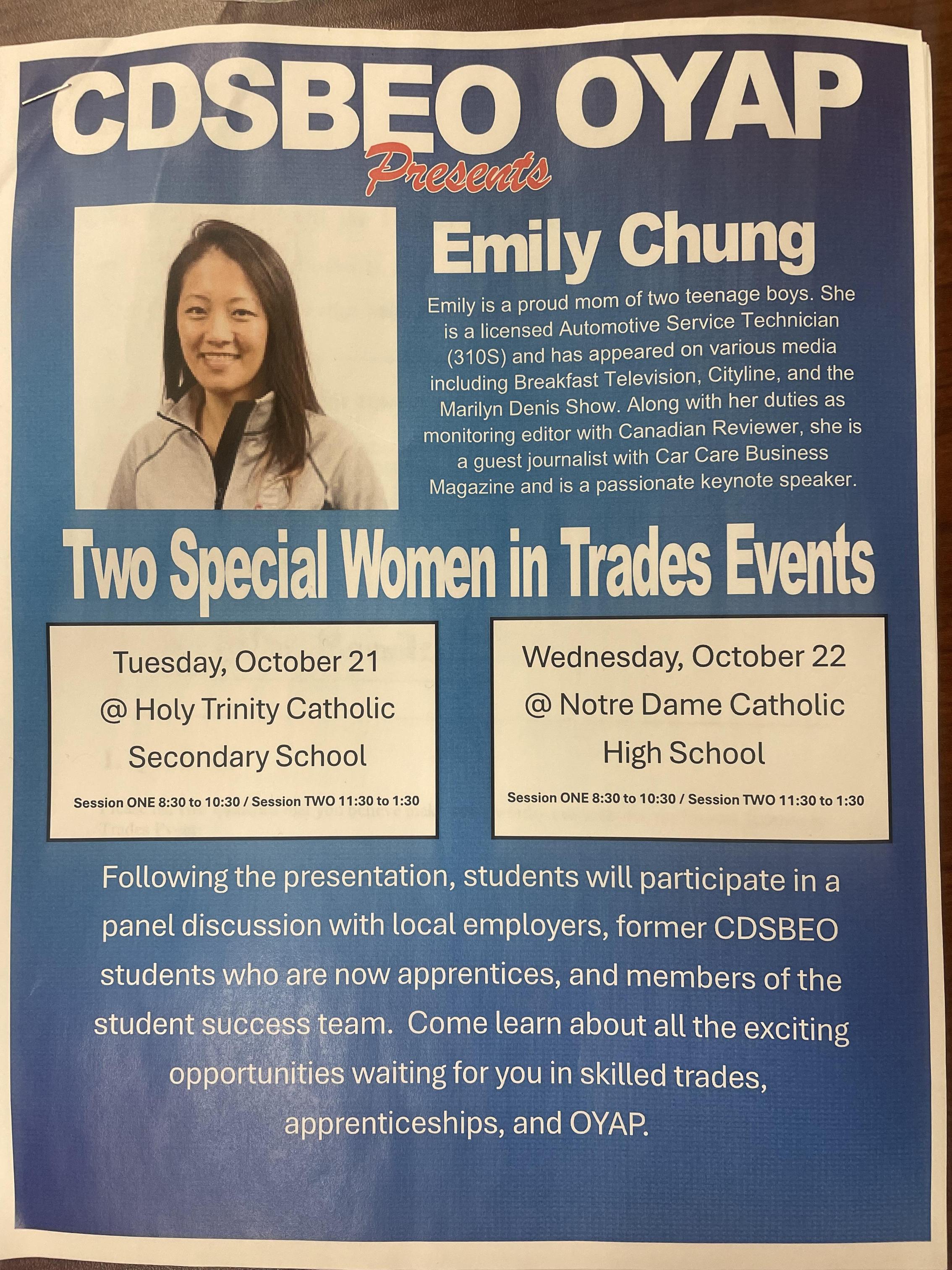 Students who attend will have the opportunity to learn about women in different trades, and speak with a variety of experienced individuals who are local employers, currently apprentices and/or members of CDSBEO's student success team.